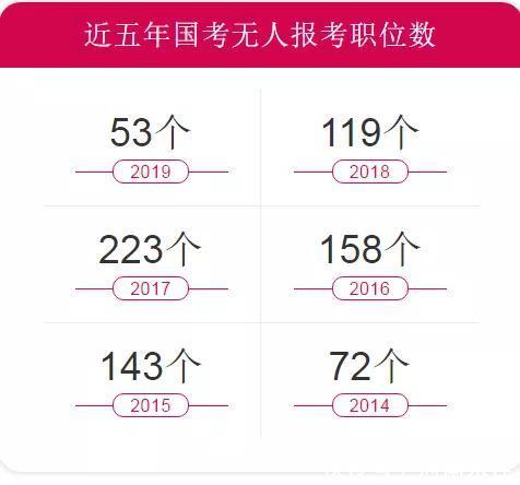 2019年國考共53個職位無人報考,2018年國考共119個職位無人報考。2018年無人報考職位全部來自中央國家行政機關直屬機構(省級及以下)和參照公務員法管理事業(yè)單位兩個系統(tǒng),分別有75、44個職位無人報名,中央部委職位全部有人報考,僅1個省級職位無人報考,其余全部來自市及以下職位。